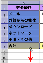 - マウスを下方向にドラッグして、点線の枠を2セル下に動かす