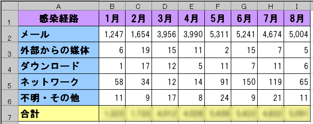 課題: ウィルス発見届出状況の表の作成内容4月〜8月までの、ウィルス発見届出状況のデータを追加して、 最新のデータを揃えましょう。 そして、ここまでの作業と同じように、セルの設定や罫線なども設定しましょう。