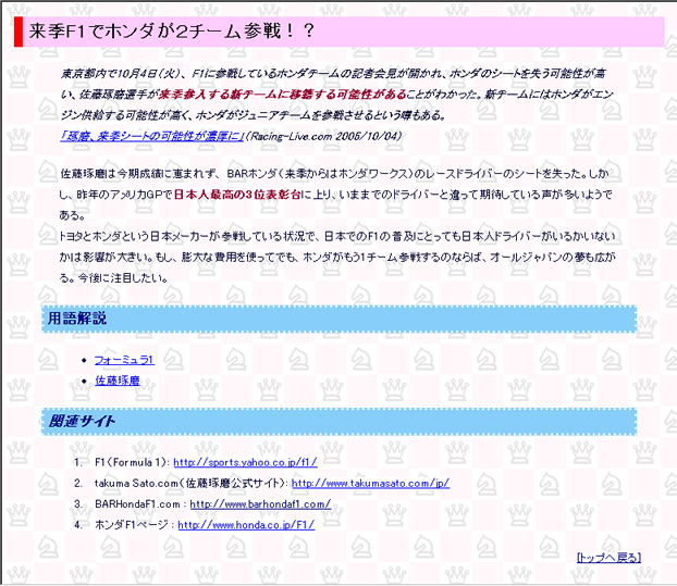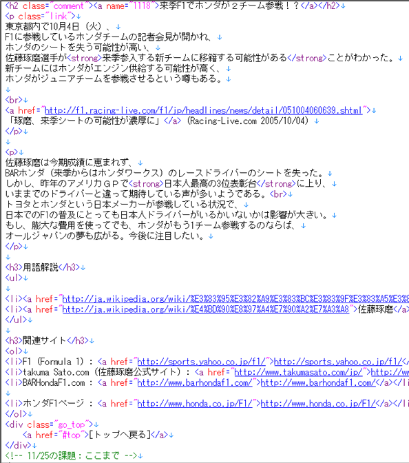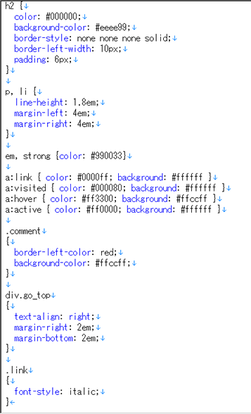 課題: ネット上の記事へのコメントをHTMLファイルにする前回と同様に、HTMLファイルを作成していきます。 HTMLファイルの内容は、 「インターネット上のニュースへのコメント」 とします。 インターネット上の記事にコメントをする1.情報を集める自分が現在興味のあるテーマについて、 インターネットからニュース等を探して、 自分が興味を持った記事を1つ集めなさい。 やり方は、第3回の課題と同じです。 第3回の課題の説明を見てください。 2.情報にコメントをつける記事を探したら、次の順にコメントを作りなさい。 なお、文字数は、「100〜150文字程度」としますが、 内容はささいなことでかまいません。 やり方は、第3回の課題と同じです。 第3回の課題の説明を見てください。 HTMLファイルの作成第6回の課題で作成したファイルをもとに、 今回の課題を作成します。 コメントの追加・目次の更新次のようなレイアウトになるように、 今回作ったコメントを追加して、目次の部分を更新します。 第2回〜第4回までの、HTMLの技術を使って、作成してください。 ページのタイトル 目次 ・第7回のコメントへのリンク ・第6回のコメントへのリンク ・第4回のコメントへのリンク ・第3回のコメントへのリンク ・第2回のコメントへのリンク ・プロフィール --- 第7回の課題のコメント ... [トップへ戻る] 第6回の課題のコメント ... [トップへ戻る] 第4回の課題のコメント ... [トップへ戻る] 第3回の課題のコメント ... [トップへ戻る] 第2回の課題のコメント ... [トップへ戻る] プロフィール ... [トップへ戻る] --- 連絡先・著作権の情報 </pre> 作成するときの注意点は、次のとおりです。 -コメントを作る --それぞれのコメントの最後には、ページのトップ(一番上)にジャンプする「トップへ戻る」というリンクを作る -目次を更新する --4つのコメント(第2〜4、6〜7回)へジャンプできるリンクをつくる -第3回の課題で説明した注意点を守る -ファイルの最後にある、連絡先の「更新日」の日付を更新する #pre(novervatim){{ <address> 作成日: 2005-10-14; 更新日: 2005-11-25<br> Copyright (C) 2005 兵庫太郎, All rights reserved.<br> このページに関する問合せ先:<br> E-Mail. <a href="mailto:e2041000@ed.hyogo-dai.ac.jp"> e2041000@ed.hyogo-dai.ac.jp</a> </address> </pre> その他の注意点は、第4回の課題の説明を見てください。 **CSSファイルの作成 [#ya26744d] コメントが書かれたHTMLファイルに、スタイルを設定します。 今回は、HTMLファイルとは別に、 スタイルシートの設定が書かれたCSSファイルを作成します。 ファイル名は、次のとおりとします。 -ファイル名: style.css CSSを使って、HTMLファイルの各要素に次のような設定をしてください。 -今回分:「クラス」を使った設定をする --マージンや周りの空間の設定(margin, padding) --リンク部分の設定 --フォントの設定 --位置そろえ -前回分 --ページ全体の文字色と背景色(body要素) --見出しの文字色と背景色(h1〜h6要素) --見出しの枠線の設定(色・太さ・種類)(h1〜h6要素) --段落内の文章の行間(p要素) ただし、 もし次のな設定をしている場合は、 必ず、該当する属性の設定を消してください! -ページ全体の文字色と背景色 -見出しの文字色と背景色 -見出しの枠線の設定(色・太さ・種類) -行揃え サンプルのイメージがありますので、下のリンクを参考にしてください。 - |